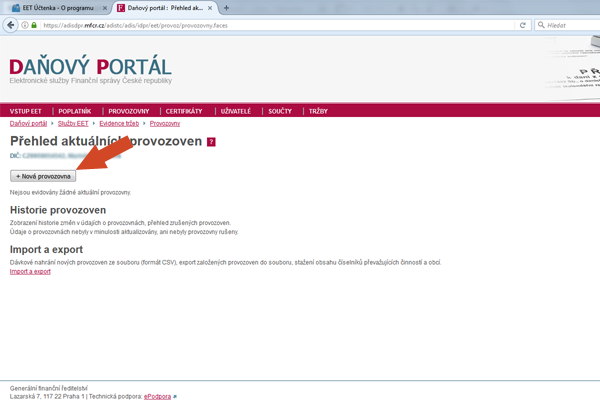 Nová provozovna je hotová. Přiřazené číslo provozovny si zapamatujte. Nyní přejdeme k vytvoření nového certifikátu.